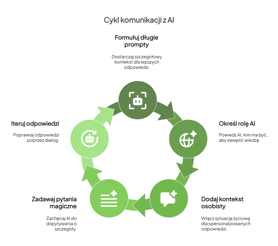Skuteczni użytkownicy AI nie pytają raz i kończą. Oni prowadzą dialog. „To lepiej, ale zmień ton na bardziej casualowy.” „Dodaj konkretne przykłady.” „Skróć o 30% ale zachowaj wszystkie kluczowe punkty.”